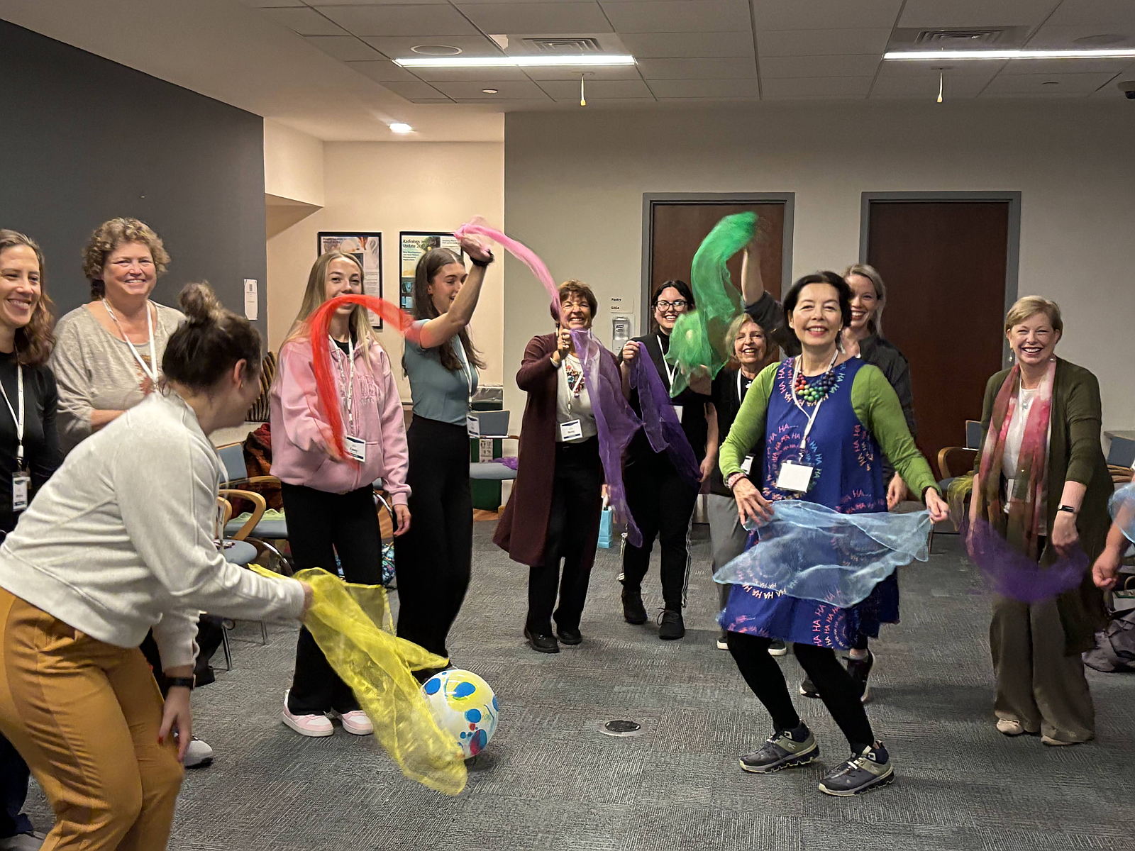 Laughter clubs offer a safe, welcoming space where people can spend an hour connecting in a light-hearted, positive way through laughter, yogic breathwork, and mindfulness. We also weave in the 4 Elements of Joy—laughter, singing, dance, and play—to create a rich, uplifting experience. A strong spirit of playfulness and improvisation invites each person to gently “let go,” feel at ease, and explore a more carefree, authentic way of expressing themselves.